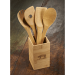 This classic bamboo 5 piece kitchen utensil set includes 4 durable utensils, each measuring 11.8", conveniently stored in a durable bamboo canister. Tools included are a rounded fork, single hole mixing spoon, turner spatula and spoon. This is the perfect accessory to any kitchen. Due to the nature of the bamboo material, variations in laser imprinting quality may occur.