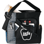 Great for tradeshows, conventions, and business meetings. Main zippered compartment. Front zippered pocket with full interior organization. Vertical media pocket with earbud port access. Side mesh and accessory pockets. Adjustable shoulder strap.